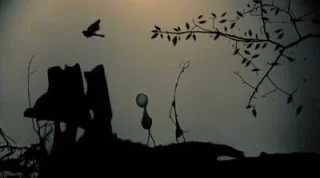 In strictly visual terms Aubade (2007) is a dark movie. Thematically however it is optimistic in a whimsical kind of way. Man finds bird dying, deceased, dead. Definitely dead. In my experience, limited admittedly, birds lying on their backs with claws in the air, tweeting weakly, die. Not in the hands of Pierre Bourrigault. Man takes bird to light bulb on stem and together they visit the desk of the woman with wings at the Animal Repair Works. Much whirring, flashing and a Heath Robinson rustic conveyor system that eventually leads to a branch of a tree that sprouts leaves as the creature passes by, to miraculously recover and soar like a ...... bird. Made in 2D and stop motion, it is entirely shot in silhouette against a backdrop of perpetual dusk, has a set lit by low voltage lighting and characters that maybe are humanoid but I'm betting no money on it. The movie sort of unfolds before our eyes. I use a word like whimsical; in fact the short is played straight, dead straight and I enjoyed it, particularly given a pleasant soundtrack by the young Italian classical guitarist and composer, Lorenzo Tomio. After being educated in fashion and design in La Rochelle, Paris, Pierre worked for over twenty years in the fashion and advertising industry, with major clients such as Benetton and Diesel. His website is ultra cool - scroll sideways and click on the various illustrations and fashion items that, were it not for the free fall of the British pound, I would want more of. I know of no other animation from the director.